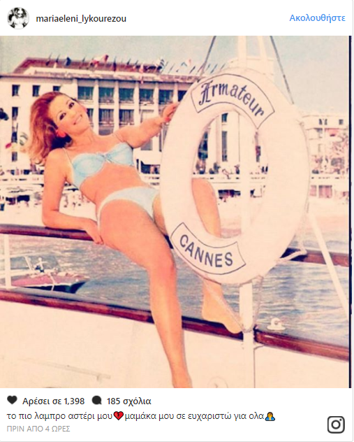 Η Μαρία Ελένη Λυκουρέζου αποχαιρέτισε για πάντα τη λατρεμένη της μητέρα με μια φωτογραφία και λίγα λόγια αγάπης και τρυφερότητας "το πιο λαμπρό αστέρι μου μαμάκα μου σε ευχαριστώ για όλα"...