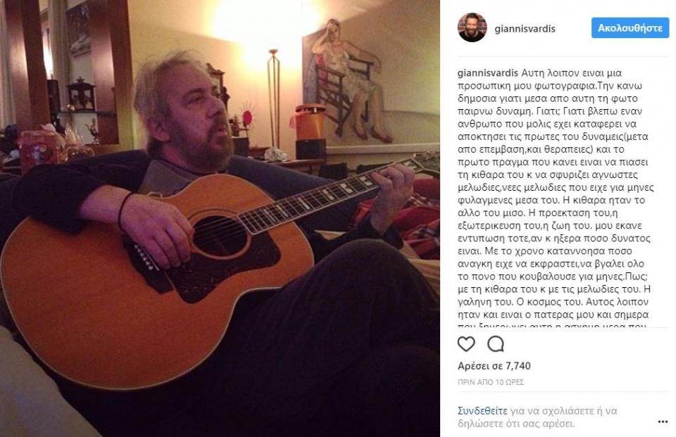 «Αυτή λοιπόν είναι μια προσωπική μου φωτογραφία. Την κανω δημοσια γιατι μεσα απο αυτη τη φωτο παιρνω δυναμη. Γιατι; Γιατι βλεπω εναν ανθρωπο που μολις εχει καταφερει να αποκτησει τις πρωτες του δυναμεις (μετα απο επεμβαση, και θεραπειες) και το πρωτο πραγμα που κανει ειναι να πιασει τη κιθαρα του και να σφυριζει αγνωστες μελωδιες, νεες μελωδιες που ειχε για μηνες φυλαγμενες μεσα του. Η κιθαρα ηταν το αλλο του μισο. Η προεκταση του, η εξωτερικευση του, η ζωη του. Μου εκανε εντυπωση τοτε, αν και ηξερα ποσο δυνατος ειναι. Με το χρονο καταννοησα ποσο αναγκη ειχε να εκφραστει, να βγαλει ολο το πονο που κουβαλουσε για μηνες. Πως; Με τη κιθαρα του κ με τις μελωδιες του. Η γαληνη του. Ο κοσμος του. Αυτος λοιπον ηταν και ειναι ο πατερας μου και σημερα που ξημερωνει αυτη η ασχημη μερα που με καρφωνει στη καρδια οποτε ερχεται, θελω να σας πω δημοσια ποσο περηφανος, ποσο τυχερος, ποσο γεματος αισθανομαι που εζησα πλαι του και ειχα για πατερα αυτον τον ανθρωπο. Μπαμπα μου σαγαπαω καθε μερα παραπανω. 3 χρονια και η σκεψη μου καθε στιγμη πανω σου. Να εισαι καλα εκει που εισαι!!».