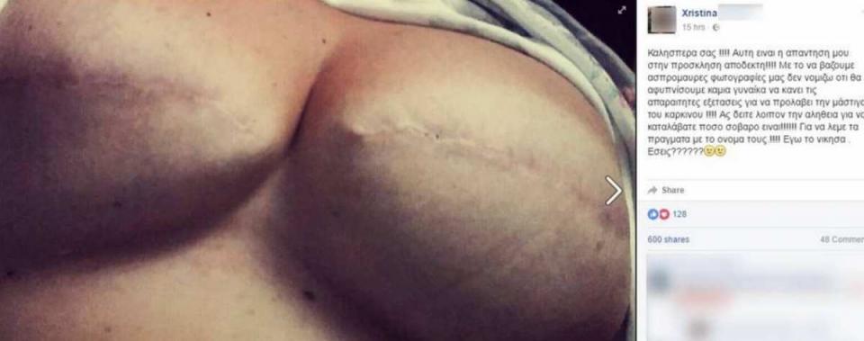 Μια νέα κοπέλα από την Ελλάδα, η Xριστίνα, είχε το θάρρος να δημοσιεύσει το στήθος της μετά την μαστεκτομή. H νεαρή κοπέλα το έκανε, για να καταφέρει να δώσει ένα αληθινό μήνυμα στις γυναίκες. Η φωτογραφία της έχει ήδη πάνω από 600 shares και έχει συγκλονίσει και ευαισθητοποιήσει πολλές γυναίκες.