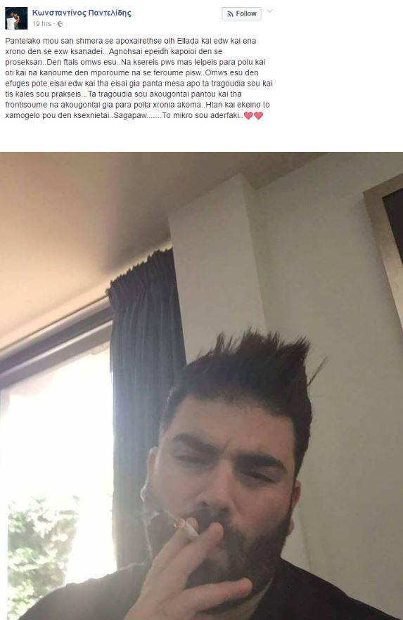 Ο μικρός του αδελφός, Κωνσταντίνος Παντελίδης, στέλνει το δικό του μήνυμα στον αδερφό του μέσα από τον προσωπικό του λογαριασμό στο Facebook.