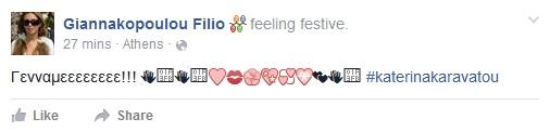 Το χαρμόσυνο γεγονός αποκάλυψε μέσω του προσωπικού της προφίλ στο facebook, η αρχισυντάκτρια της εκπομπής «Στα Καλά Καθούμενα», Φιλιώ Γιαννακοπούλου. «Γεννάμεεεεεε», έγραψε χαρακτηριστικά.