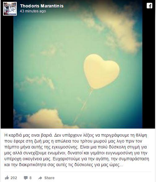 Το μήνυμα του Θοδωρή: "Η καρδιά μας είναι βαριά. Δεν υπάρχουν λέξεις να περιγράψουμε τη θλίψη που έφερε στη ζωή μας η απώλεια του τρίτου μωρού μας λίγο πριν τον πέμπτο μήνα αυτής της εγκυμοσύνης. Είναι μια πολύ δύσκολη στιγμή για μας αλλά συνεχίζουμε ενωμένοι, δυνατοί και γεμάτοι ευγνωμοσύνη για την υπέροχη οικογένεια μας. Ευχαριστούμε για την αγάπη, την συμπαράσταση και την διακριτικότητα σας αυτές τις δύσκολες για μας ώρες...".