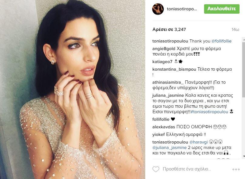 Ανάμεσά τους και η Τόνια Σωτηροπούλου η οποία επέλεξε να φορέσει μία υπέρλαμπρη τουαλέτα με δαντέλα και διαμάντια του ελληνικού σχεδιαστικού δίδυμου MI RO.