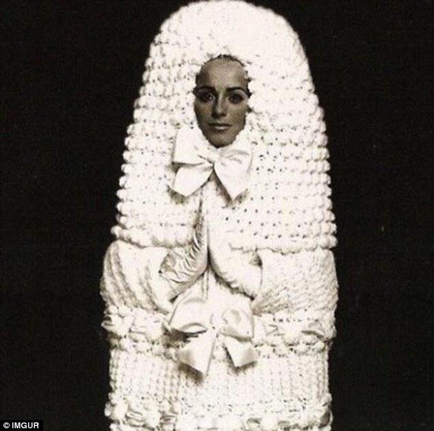 Για τις πολύ κρύες νύχτες του χειμώνα, ο σχεδιαστής επέλεξε ένα νυφικό πλεκτό με βελονάκι που αφήνει μόνο το πρόσωπο της νύφης ακάλυπτο