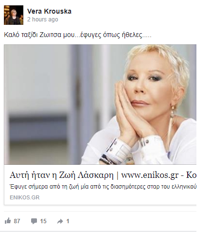 «Καλό ταξίδι Ζωίτσα μου…έφυγες όπως ήθελες» ήταν τα λόγια της Βέρας Κρούσκα, λίγο αφού έγινε γνωστό πως η Ζωή Λάσκαρη βρέθηκε νεκρή στο σπίτι της στο Πόρτο Ράφτη το μεσημέρι της Παρασκευής 18 Αυγούστου.