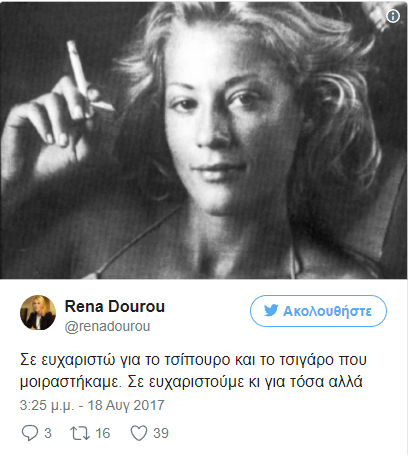 Μέσα από την προσωπική της σελίδα στο twitter, η ανέβασε μια ασπρόμαυρη φωτογραφία της Ζωίτσας και συνόδευσε τη φωτογραφία με ένα συγκινητικό μήνυμα: «Σε ευχαριστώ για το τσίπουρο και το τσιγάρο που μοιραστήκαμε. Σε ευχαριστούμε κι για τόσα άλλα».