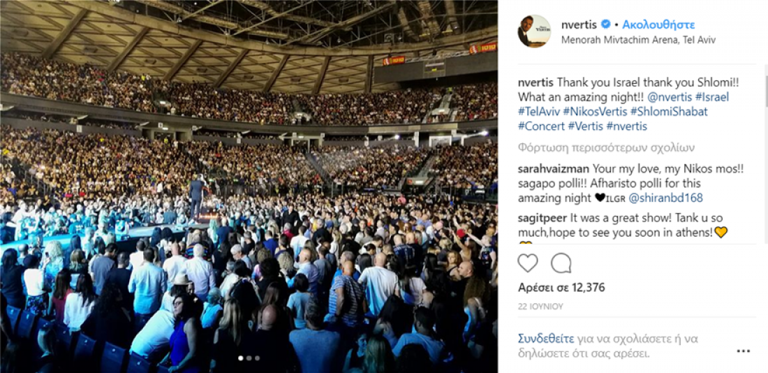 Την αποθέωση γνώρισε ο Νίκος Βέρτης στο Ισραήλ, όπου τραγούδησε μπροστά σε 15.000 ανθρώπους που έσπευσαν στο Menorah Mivtachim Arena στο Τελ Αβίβ για να τον απολαύσουν.