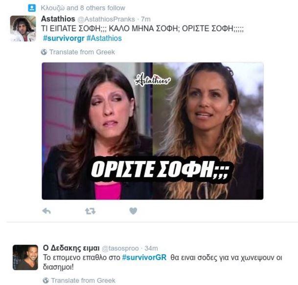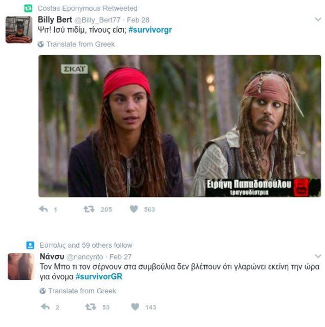 Τρελό γέλιο με τις ατάκες των χρηστών στο Twitter για το χθεσινό επεισόδιο του Survivor με την Ειρήνη ... Τζόνι Ντεπ, την Σόφη Πασχάλη και την... Ζωή Κωνσταντοπούλου και κλασικά, τον Μπο!