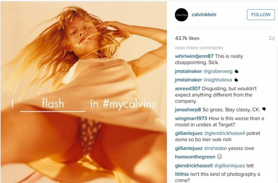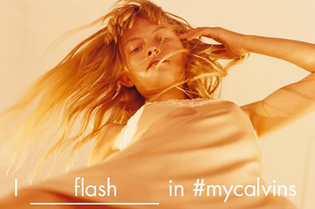 Πρωταγωνίστρια της καμπάνιας είναι η 23χρονη Klara Kristin και στη φωτογραφία ο φωτογραφικός φακός εστιάζει στους μηρούς και το εσώρουχό της. Το μήνυμα που συνοδεύει τη φωτογραφία, είναι "Επιδεικνύω τα #Κάλβινμου" ("I_flash_in #mycalvins").
