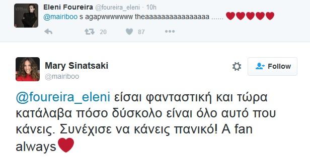 Πώς αντέδρασε όμως η ίδια η Ελένη Φουρέιρα στη μίμηση της Μαίρης Συνατσάκη; Μέσω του προσωπικού της προφίλ στο twitter, η ταλαντούχα pop star έγραψε: «Σ' αγαπώωωωωωωωω!! Θεά» , με την παρουσιάστρια να της απαντά: «Είσαι φανταστική και τώρα κατάλαβα πόσο δύσκολο είναι όλο αυτό που κάνεις. Συνέχισε να κάνεις πανικό! A fan always» .