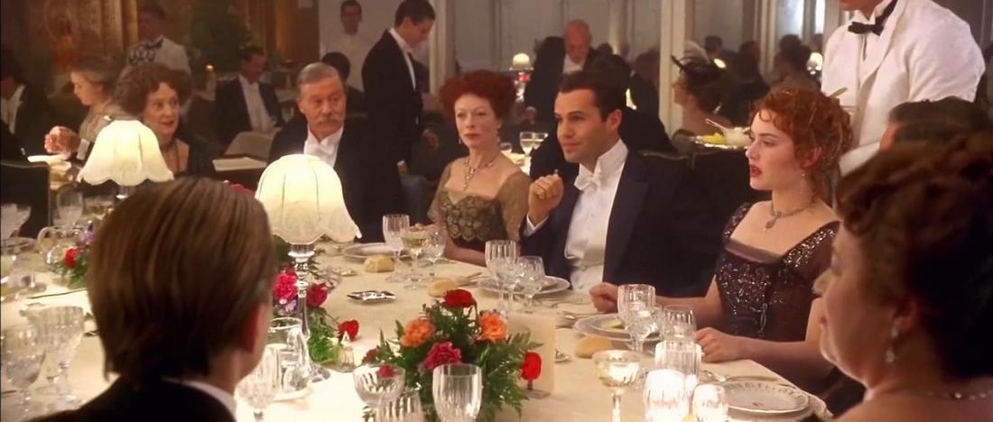 'Οπως θα περίμενε κανείς, το μενού της Πρώτης Θέσης είναι γεμάτο εκλεκτές λιχουδιές: Σολωμός, γαρίδες, μοσχαράκι, παϊδάκια, αλλά και τυριά όπως γκοργκονζόλα, ροκφόρ, καμαμπέρ. Και φυσικά οι επιβάτες της Πρώτης Θέσεις είχαν άπειρες επιλογές.
