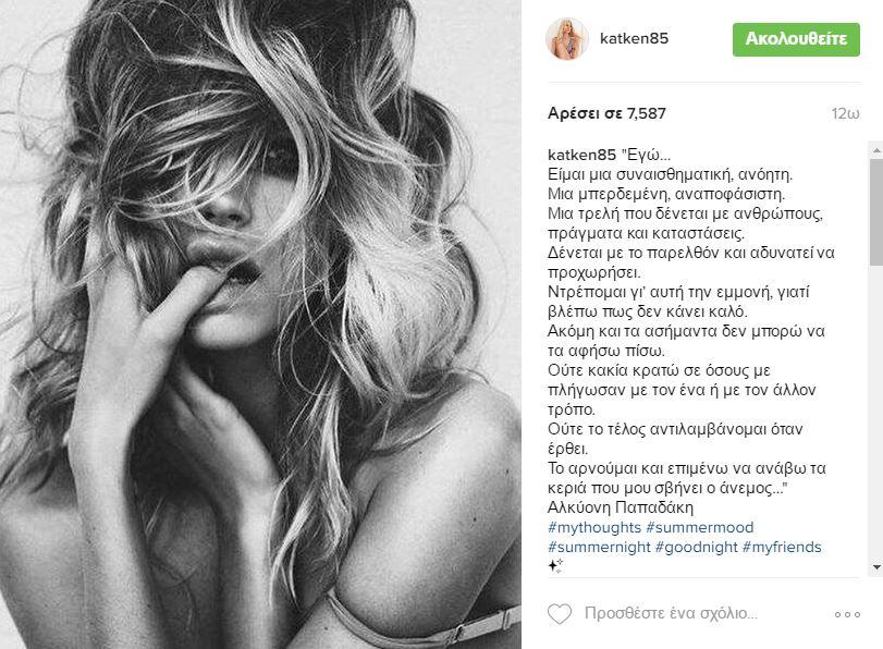 Αξίζει να σημειωθεί πως και οι δύο δεν έχουν κάνει καμία δήλωση για τις φήμες που έχουν γίνει έντονες τον τελευταίο καιρό. Μάλιστα, η όμορφη παρουσιάστρια ανέβασε πριν λίγες ώρες μια φωτογραφία στο Instagram με αινιγματική λεζάντα από ποητικά λόγια της Αλκυόνης Παπαδάκη που μάλλον, σύμφωνα με την Κατερίνα, παραπέμπουν και στην ιδιοσυγκρασία της. Δηλώνει μπερδεμένη, αναποφάσιστη και δεμένη με το παρελθόν...