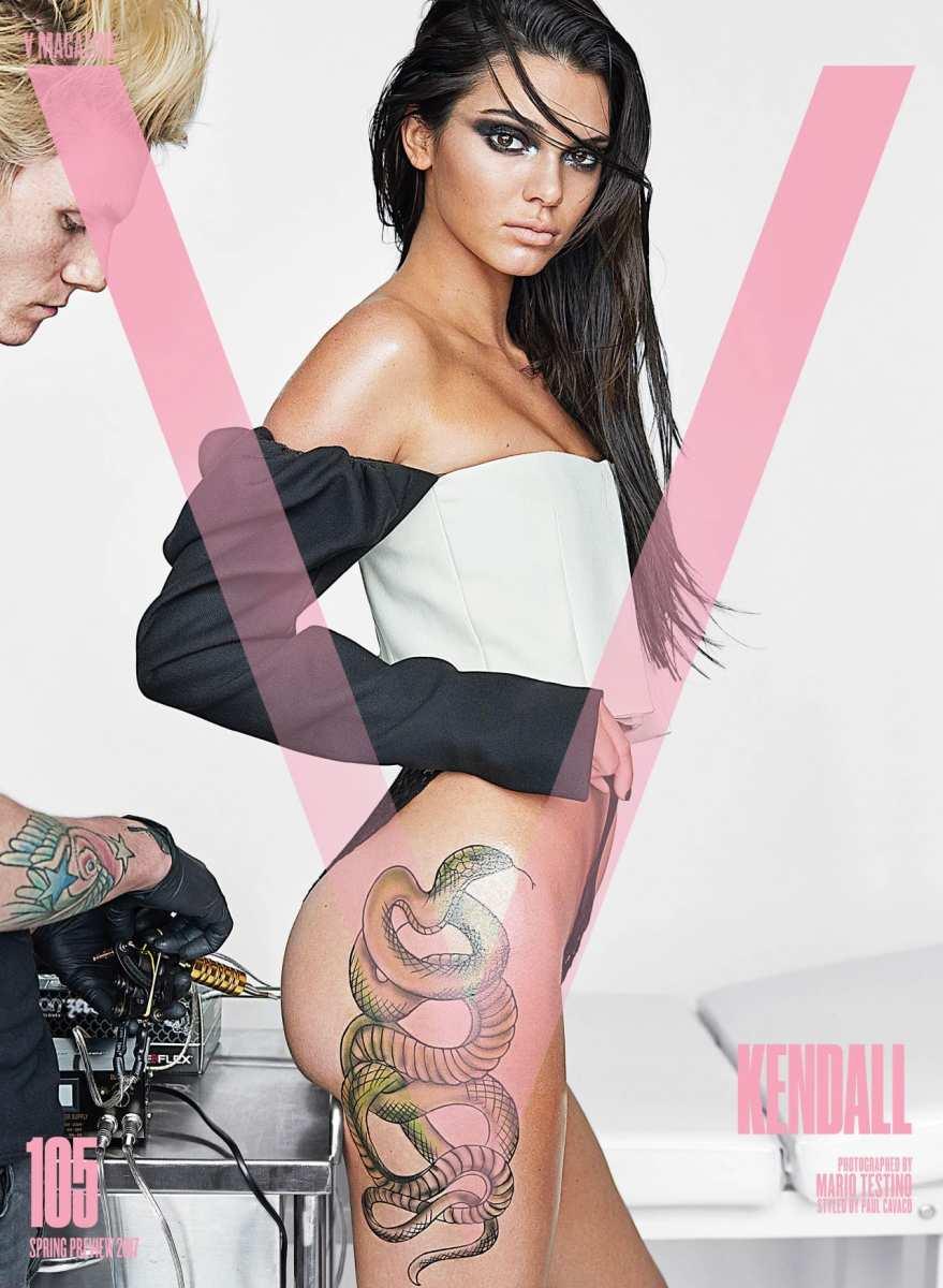 Όχι. Η Κένταλ Τζένερ δεν έχει τατουάζ! Για τις ανάγκες όμως της φωτογράφισης, ο Mario Testino επέλεξε να "διακοσμήσει" το κορμί της μικρότερης αδερφής της Κιμ Καρντάσιαν με ένα τεράστιο τατουάζ - φίδι, στην πίσω όψη της.