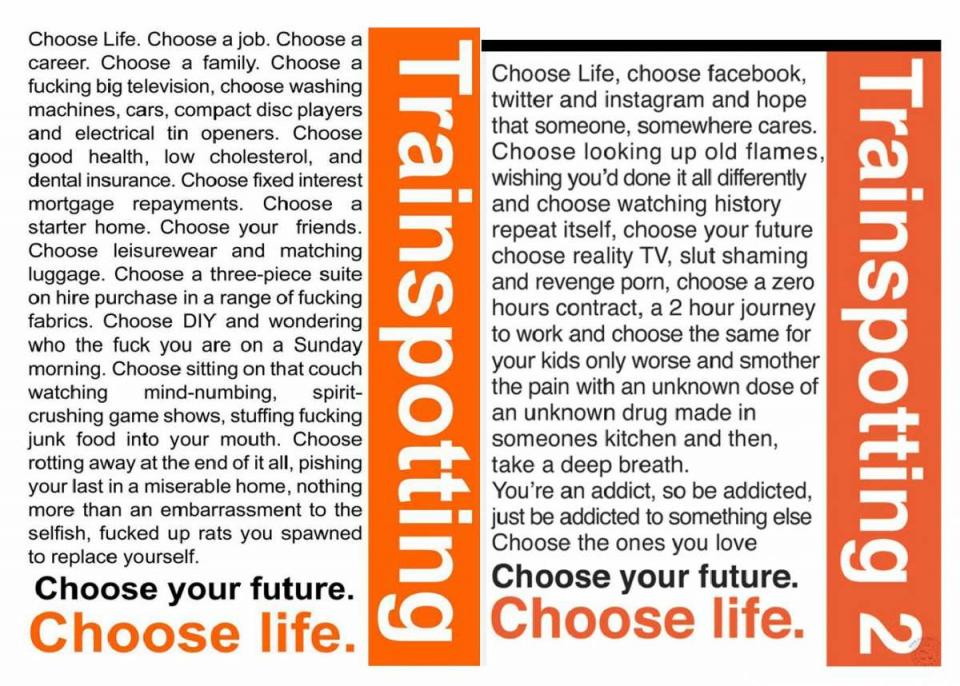 Με το "μάντρα" της ζωής τους να έχει αλλάξει σύμφωνα με τα σημερινά δεδομένα, ο χαρακτήρας του ΜακΓκρέγκορ μας προτρέπει στο τρέιλερ με το χαρακτηριστικο λόγο της ταινίας "Διάλεξε τη ζωή. Διάλεξε το Facebook, το Twitter, το Instagram κι ευχήσου κάποιος, κάπου να νοιάζεται."