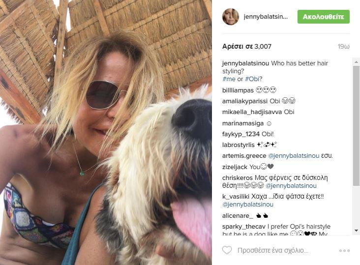 Εκτός πάντως από τις φώτο με τα τοπία, η Τζένη Μπαλατσινού μοιράστηκε με τους χιλιάδες followers της και ένα αρετουσάριστο στιγμιότυπο, στο οποίο ποζάρει άβαφη, αχτένιστη και με μπικίνι , παρέα με τον τετράποδο φίλο της Όμπι , συνοδεύοντας την φώτο με το σχόλιο:"Ποιος έχει καλύτερα μαλλιά;!"