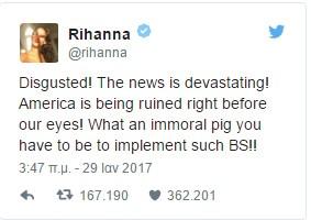 Η τραγουδίστρια Ριάνα, σε tweet της εξέφρασε έντονα την άποψη της, χαρακτηρίζοντας τον πρόεδρο της Αμερικής «ανήθικο γουρούνι»: