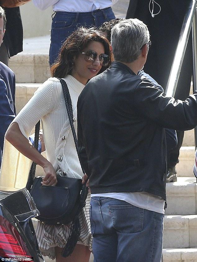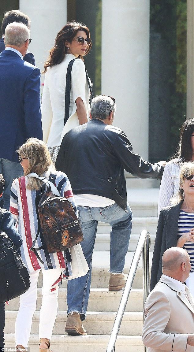 Το ζευγάρι ευδιάθετο και κομψο έφτασε στο ξενοδοχείο με μια μαύρη θωρακισμένη Mercedes. Όλο χαμόγελα και ιδιαίτερα φιλικοί ο Τζορτζ και η Αμάλ δεν φάνηκε να ενοχλούνται από τα φλας των φωτογράφων.