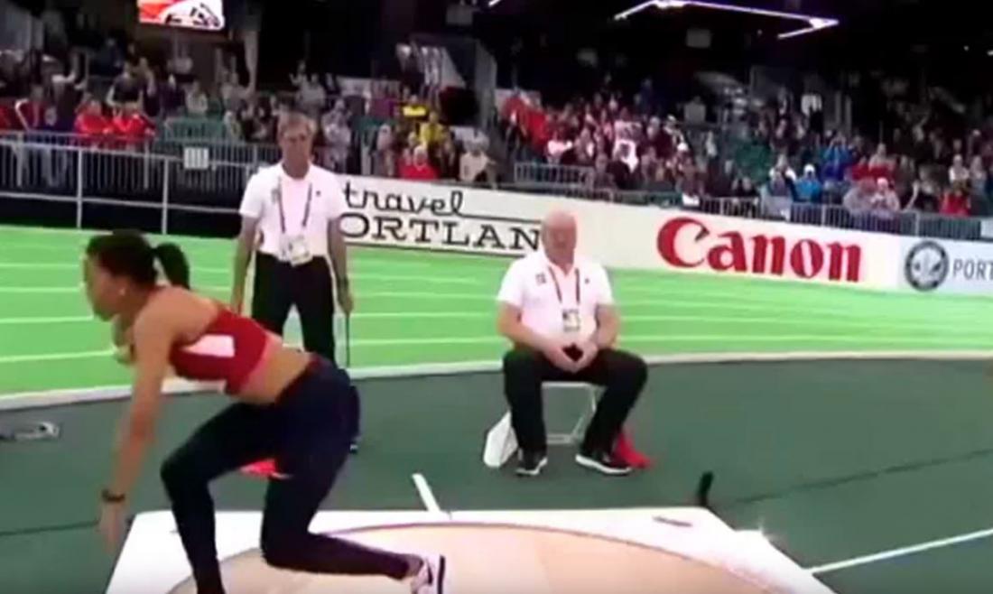 Η Κέντελ Ουίλιαμς "σημάδεψε" φωτογράφο κατά τη διάρκεια της σφαιροβολίας πεντάθλου στο παγκόσμιο πρωτάθλημα κλειστού στίβου στο Πόρτλαντ.