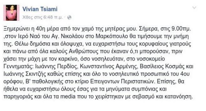 Σαράντα ημέρες πέρασαν από τότε που η μητέρα της όμορφης Βιβής Τσιάμη «έφυγε» από τη ζωή. Με την αφορμή αυτή, το γνωστό μοντέλο ανήρτησε ένα πολύ συγκινητικό μήνυμα στον προσωπικό της λογαριασμό στο Facebook, για την αγαπημένη της μητέρα.