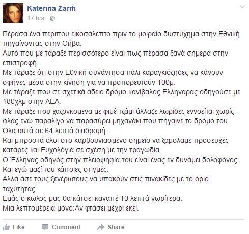 «Πέρασα ένα περίπου εικοσάλεπτο πριν το μοιραίο δυστύχημα στην Εθνική πηγαίνοντας στην Θήβα. Αυτό που με τάραξε περισσότερο είναι πως πέρασα ξανά σήμερα στην επιστροφή. Με τάραξε ότι στην Εθνική συνάντησα πάλι καραγκιόζηδες να κάνουν σφήνες μέσα στην κίνηση για να προπορευτούν 100μ. Με τάραξε που σε σχετικά άδειο δρόμο κανίβαλος Ελληνάρας οδηγούσε με 180χλμ στην ΛΕΑ. Με τάραξε που χαζογκόμενα με φιμέ τζάμι άλλαζε λωρίδες εννοείται χωρίς φλας ενώ παραλίγο να παρασύρει μηχανάκι που πήγαινε το δρόμο του. Όλα αυτά σε 64 λεπτά διαδρομή. Και μπροστά όλοι στο καρβουνιασμένο σημείο να ξαμολάμε προσευχές κατάρες και Ευχολόγια σε σχέση με την τραγωδία.