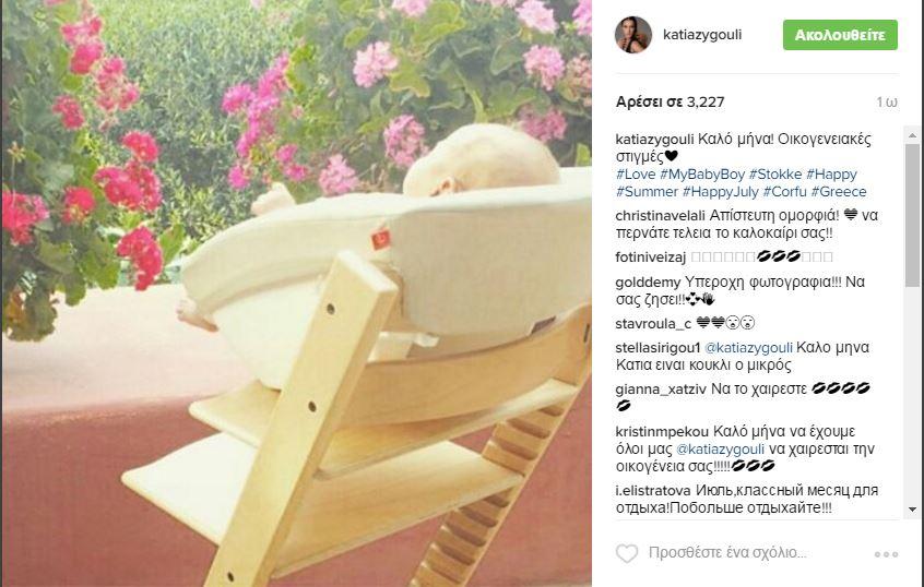 Αυτή τη φορά, η Κάτια "ανέβασε" μια πολύ γλυκιά φωτογραφία με το νεογέννητο αγοράκι της να κάθεται σε παιδικό κάθισμα! Η λεζάντα έγραφε: "Kαλό Μήνα. Οικογενειακές στιγμές" ενώ είχε hashtag, Κέρκυρα που μάλλον επισκέφτηκε το ζευγάρι για λίγες διακοπές αναψυχής στο φορτωμένο πρόγραμμα του Σάκη.