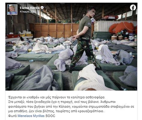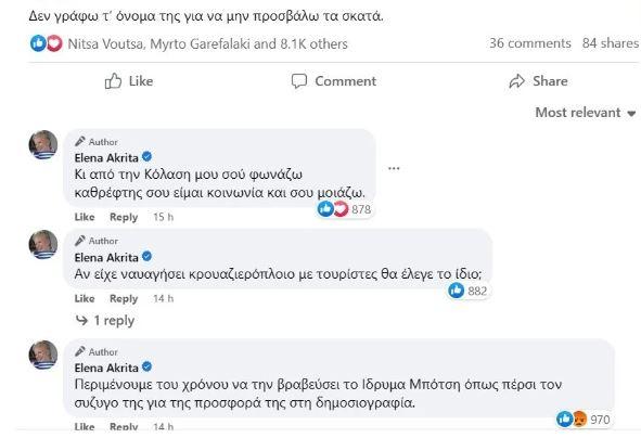 Η Έλενα Ακρίτα αρχικά έγραψε στο facebook: «Δεν γράφω τ’ όνομα της για να μην προσβάλω τα σκατά». Και πρόσθεσε: «Αν είχε ναυαγήσει κρουαζιερόπλοιο με τουρίστες θα έλεγε το ίδιο; Περιμένουμε του χρόνου να την βραβεύσει το Ίδρυμα Μπότση όπως πέρσι τον σύζυγό της για της προσφορά της στη δημοσιογραφία».