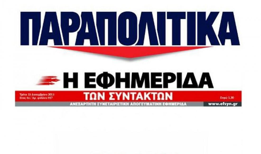 Συγκεκριμένα, στο φύλλο Σαββάτου των «Παραπολιτικών» φιλοξενείτε δημοσίευμα που αναφέρεται σε στην «Εφημερίδα των Συντακτών» οι οποίες μάλιστα συνοδεύονται από .
