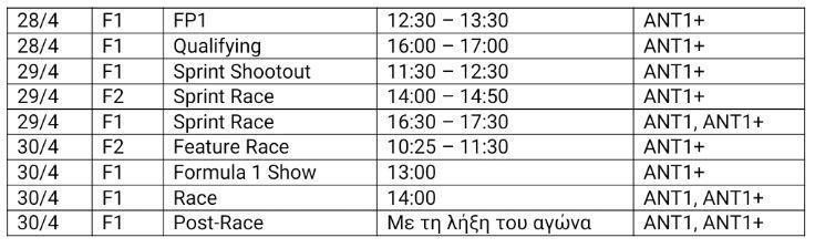Η εκπομπή «Formula 1 Show» την Κυριακή θα ξεκινήσει μια ώρα νωρίτερα στις 13:00 στο ΑΝΤ1+, στην οποία, μεταξύ άλλων, μπορείτε να παρακολουθήσετε μια συνέντευξη του Μικ Σουμάχερ, δοκιμαστή της Mercedes. Στην παρουσίαση της εκπομπής και στις μεταδόσεις θα βρίσκονται ο Τάκης Πουρναράκης, ο Κώστας Λεώνης και η Μαρία Θωμά για την lifestyle προσέγγιση της F1! Η εκπομπή «Formula 1 Show» θα συνεχιστεί και μετά το τέλος του αγώνα σε ΑΝΤ1 και ΑΝΤ1+, με highlights, ανάλυση των κρίσιμων φάσεων, της στρατηγικής των ομάδων, απευθείας συνδέσεις με τα paddock στο Μπακού, τους αγώνες της F2 κ.ά.