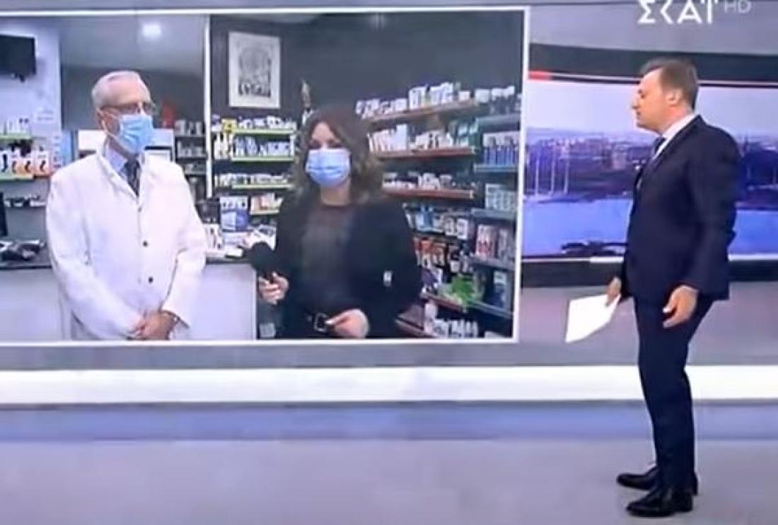 «Παραποιείτε τις εκφράσεις μου, δεν είπα ποτέ κάτι τέτοιο. Θα σας απαντήσω αν και δεν είχα διάθεση να συζητήσω με τον ΣΚΑΪ, σχετικά με τις επιφυλάξεις του για τα self τεστ. Προσπαθείτε να βάλετε λόγια σε μένα που... Σηκωθείτε και φύγετε από τον χώρο που σας φιλοξενεί αυτή τη στιγμή, ντροπή σας, φύγετε από το φαρμακείο μου. Αυτά που κάνατε το βράδυ, ντροπή σας, ντροπή σας, ντροπή σας. Άντε γεια σας».