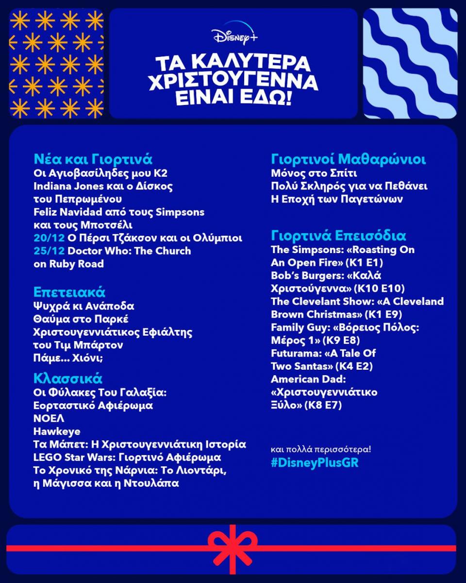 Στο Disney+ θα βρείτε πάντα κάτι νέο! Η νέα, πρωτότυπη σειρά, «Ο Πέρσι Τζάκσον και οι Ολύμπιοι», έρχεται στις 20 Δεκεμβρίου με διπλό επεισόδιο, ενώ μπορείτε επίσης να απολαύσετε την ταινία «Indiana Jones και Ο Δίσκος του Πεπρωμένου», το πιο πρόσφατο κεφάλαιο του επικού και εμβληματικού franchise, με τον Harrison Ford και τη Phoebe Waller-Bridge και τον δεύτερο κύκλο της σειράς «What If…?» των Marvel Studios. Ακόμη, στις 25 Δεκεμβρίου, έρχεται το σπέσιαλ εορταστικό επεισόδιο «Doctor Who: The Church on Ruby Road».