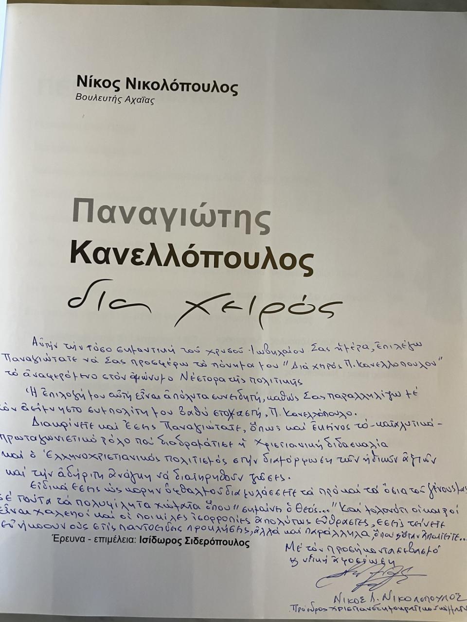 «Σας αφιερώνω το «Διά χειρός Παναγιώτη Κανελλόπουλου», αναφερόμενο στον ομώνυμο Νέστορα της πολιτικής.