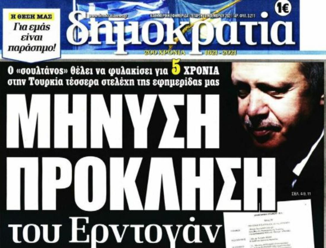 Ο Τούρκος πρόεδρος Ρετζέπ Ταγίπ Ερντογάν διώκει την εφημερίδα «δημοκρατία» και θέλει να καταδικάσει τέσσερα στελέχη της σε φυλάκιση στην Τουρκία, που μπορεί να φτάσει και τα πέντε χρόνια. Είναι η πρώτη φορά που αρχηγός ξένου κράτους στρέφεται κατά ελληνικής εφημερίδας, και μάλιστα για πολιτικούς λόγους, όπως ξεκάθαρα προκύπτει από το κείμενο της μηνύσεως που απέστειλε η εισαγγελία της ΄Αγκυρας.
