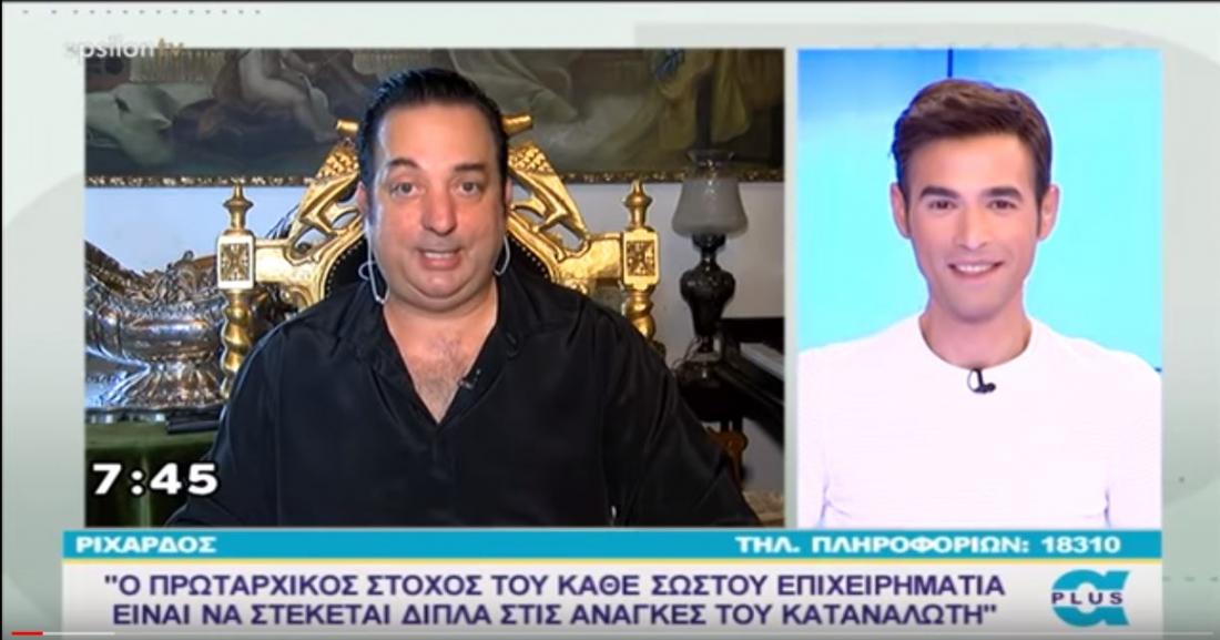 Στο απόσπασμα της εκπομπής, που έχει αναρτηθεί στο κανάλι «Apokaliptika LIVE» στο YouTube και είναι, σύμφωνα με τη λεζάντα, από τον φετινό Σεπτέμβριο, ο Ριχάρδος δεν είναι απλώς πρωταγωνιστής της συζήτησης που θα ακολουθήσει, καθώς υπάρχει και… ρεπορτάζ για την επιχείρησή του.