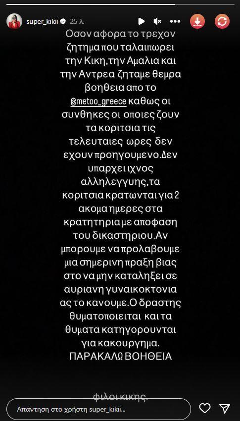 «Όσον αφορά το τρέχον ζήτημα που ταλαιπωρεί την Κική, την Αμαλία και την Άντρεα ζητάμε θερμά βοήθεια από το @metoo_greece καθώς οι συνθήκες οι οποίες ζουν τα κορίτσια τις τελευταίες ώρες δεν έχουν προηγούμενο. Δεν υπάρχει ίχνος αλληλεγγύης.