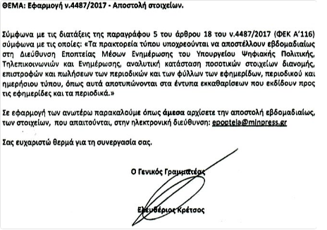 Ο ΓΓ κ. Λευτέρης Κρέτσος με επιστολή του ζητάει από τα Πρακτορεία Τύπου τα εκκαθαριστικά των κυκλοφοριών εφημερίδων κάθε εβδομάδα, ώστε να αναρτούνται τα πραγματικά στοιχεία και οι πραγματικοί αριθμοί κυκλοφορίας της κάθε εφημερίδας.