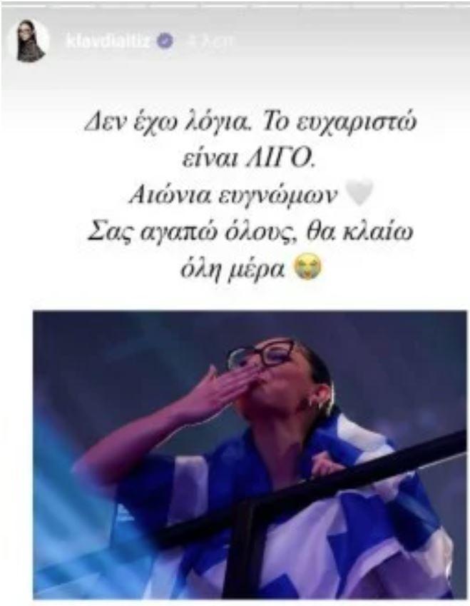 «Δεν έχω λόγια. Το ευχαριστώ είναι ΛΙΓΑ. Αιώνια ευγνώμων. Σας αγαπώ όλους, θα κλαίω όλη μέρα» έγραψε στην πρώτη της ανάρτηση η Κλαυδία μετά την επιτυχία στη Eurovision 2025 και την κατάκτηση της 6ης θέσης με το τραγούδι της «Αστρομάτα».