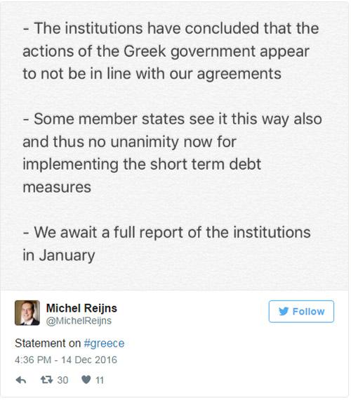 Την αναβολή της εφαρμογής των βραχυπρόθεσμων μέτρων για το χρέος μέχρι τον Ιανουάριο, οπότε αναμένεται η ολοκληρωμένη έκθεση των θεσμών, ανακοίνωσε και ο εκπρόσωπος Τυπου του προέδρου του Eurogroup, Μισέλ Ρέινς στο Twitter. «Οι θεσμοί κατέληξαν πώς οι πράξεις της ελληνικής κυβέρνησης φαίνονται να μην είναι συμβατές με τις συμφωνίες μας», ανέφερε ο ίδιος, προσθέτοντας πως μετά από ενστάσεις κάποιων κρατών-μελών «δεν επιτεύχθηκε ομοφωνία για την εφαρμογή των βραχυπρόθεσμων μέτρων».