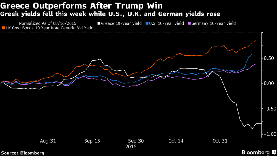 «Οι τιμές των κρατικών ομολόγων μειώθηκαν σε παγκόσμιο επίπεδο αυτή την εβδομάδα, λόγω προσδοκιών ότι ο επόμενος Πρόεδρος των ΗΠΑ, Ντόναλντ Τραμπ θα αυξήσει τον πληθωρισμό, αλλά μία χώρα έμεινε έως τώρα έξω από αυτή την υποχώρηση: Η Ελλάδα», αναφέρει δημοσίευμα του πρακτορείου Bloomberg. Σημειώνεται ότι οι τιμές των ομολόγων κινούνται αντίθετα από τις αποδόσεις τους.