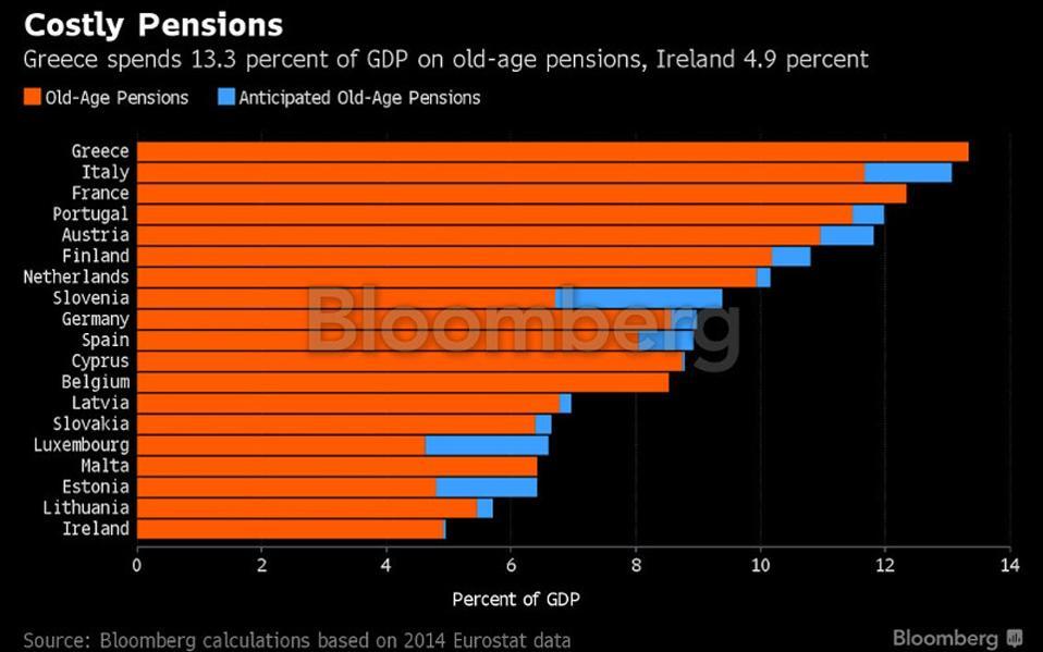 Έναν από τους κυριότερους λόγους διαφωνίας στις διαπραγματεύσεις της ελληνικής κυβέρνησης με τους δανειστές είναι αυτό των δαπανών για τις συντάξεις. Το Bloomberg παρουσιάζει με γράφημα το ποσοστό του ΑΕΠ το οποίο δαπανά κάθε χώρα της Ευρωζώνης στον συγκεκριμένο τομέα.