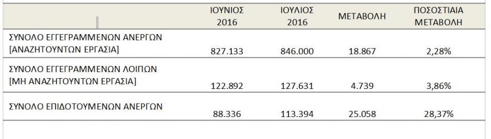 Σύμφωνα με τα τελευταία στοιχεία του ΟΑΕΔ, το σύνολο των επιδοτούμενων ανέργων, για τον μήνα Ιούλιο 2016 (αφορά τον αριθμό των δικαιούχων που πληρώθηκαν εντός του αντίστοιχου μήνα) ανέρχεται σε 113.394 άτομα, από τα οποία οι 108.249 (ποσοστό 95,46%) είναι κοινοί και λοιπές κατηγορίες επιδοτουμένων και οι 5.145 (ποσοστό 4,54%) είναι εποχικοί τουριστικών επαγγελμάτων. Οι άνδρες ανέρχονται σε 48.762 (ποσοστό 43,00%) και οι γυναίκες σε 64.632 (ποσοστό 57,00%).