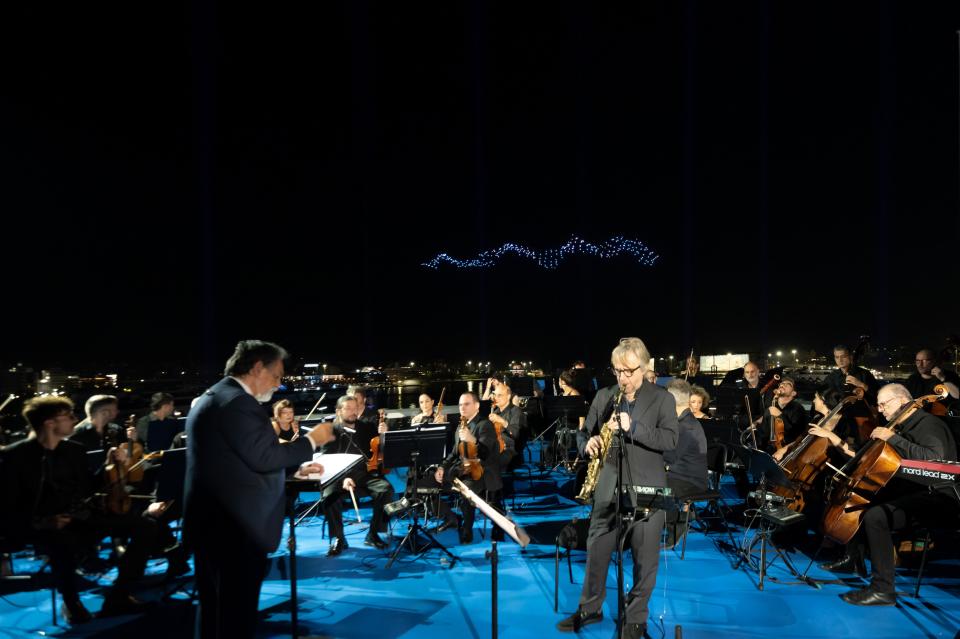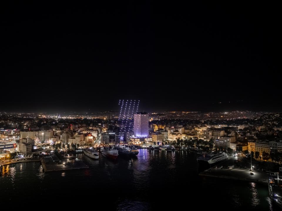 Η «Φιλαρμόνια Ορχήστρα Αθηνών», που αποτελείτο από 30 μουσικούς, υπό τη διεύθυνση του Νικόλαου Μαλιάρα, εκτέλεσε το μουσικό έργο “Βαλς της Πευκοβελόνας” του συνθέτη Αλέξανδρου Δράκου Κτιστάκη, το οποίο δημιουργήθηκε ειδικά για τη βραδιά αυτή. Ταυτόχρονα, 360 drones πέταξαν πάνω από το λιμάνι του Πειραιά σχηματίζοντας σμήνη από γλάρους και κύματα της θάλασσας, καταλήγοντας στον σχηματισμό του λογοτύπου της Piraeus Tower. Εν συνεχεία, εστίες από laser και φωτιστικές κεφαλές, συνέδεσαν τον Πύργο με διάφορα σημεία του λιμανιού, την ίδια στιγμή που 600 πυροτεχνήματα τοποθετημένα στην οροφή του κτηρίου, χρωμάτισαν τον ουρανό, προσφέροντας ένα μοναδικό υπερθέαμα.
