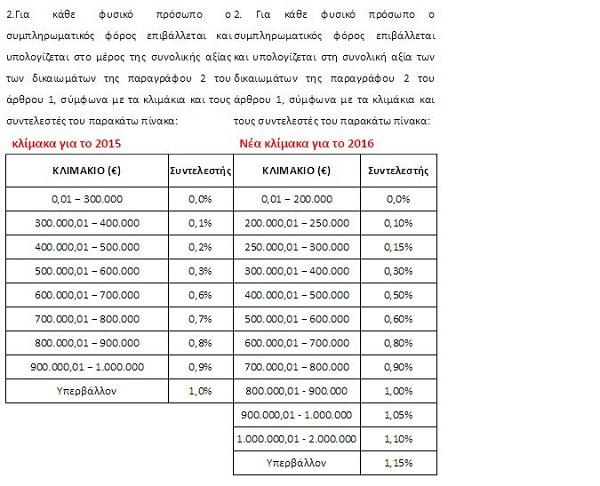 ε) Με τον νόμο 4389/2016 επίσης μειώθηκε από 300.000 σε 200.000 το αφορολόγητο για τον συμπληρωματικό φόρο και αυξήθηκαν οι συντελεστές για τον υπολογισμό του συμπληρωματικού φόρου. Η νέα κλίμακα για τον συμπληρωματικό φόρο που θα ισχύσει φέτος διαμορφώνεται ως εξής: