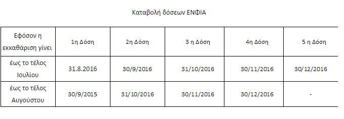 Β) Σε ισόποσες μηνιαίες δόσεις, καθεμιά από τις οποίες δεν μπορεί να είναι μικρότερη των δέκα (10) ευρώ και από τις οποίες η πρώτη δόση καταβάλλεται μέχρι την τελευταία εργάσιμη ημέρα του επόμενου μήνα από την έκδοση της πράξης προσδιορισμού φόρου, ήτοι μέχρι 31.8.2016. Οι επόμενες δόσεις θα είναι στις 30.9.2016, 31.10.2016, 30.11.2016 και 30.12.2016.