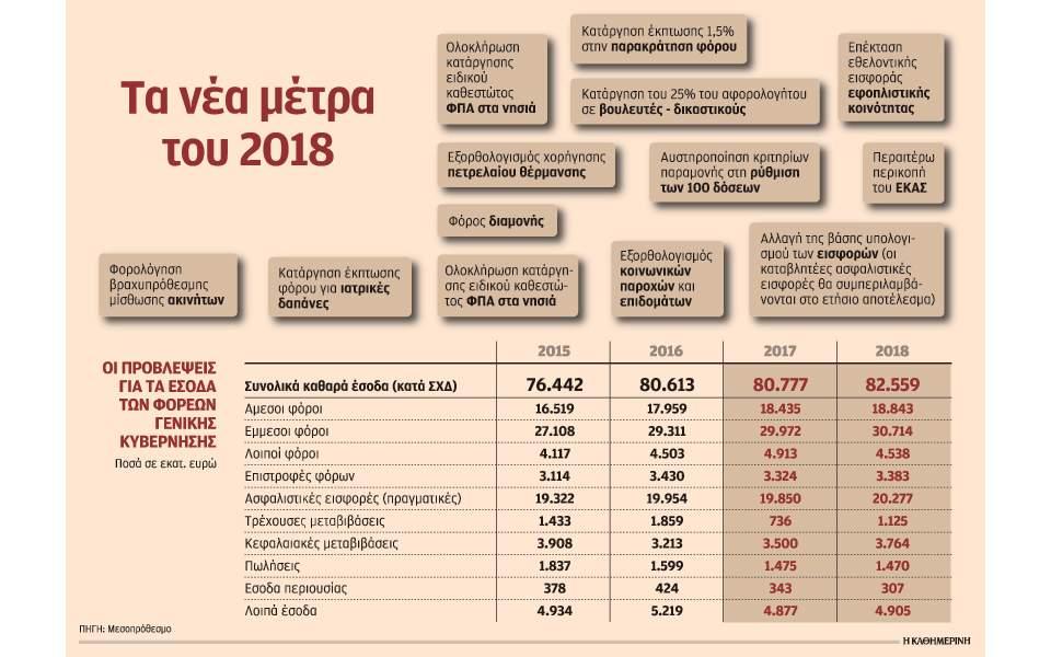 Στην κυβέρνηση αισιοδοξούν ότι παρά τις αποκλίσεις του Ιουλίου, ο φετινός προϋπολογισμός θα εκτελεστεί εντός στόχων έστω και με τη «βοήθεια» μέτρων με εφάπαξ χαρακτήρα, όπως είναι η εισπρακτική απόδοση του νόμου για την οικειοθελή αποκάλυψη εισοδημάτων, οι αυξημένες προκαταβολές φόρου για ελεύθερους επαγγελματίες και επιχειρήσεις, καθώς και οι ρυθμίσεις οφειλών παρελθόντων ετών. Για το 2018 όμως, οι διαβεβαιώσεις δεν μπορεί να είναι τόσο κατηγορηματικές. Ο πήχυς του πρωτογενούς πλεονάσματος για το 2018 ανεβαίνει κατά 3,18 δισ. συγκριτικά με το 2017 και αυτό υπό την προϋπόθεση ότι ο φετινός προϋπολογισμός θα εκτελεστεί «κατά γράμμα». Για την επόμενη χρονιά, προβλέπονται τουλάχιστον 11 νέα εισπρακτικά μέτρα στο σύνολό τους, έχουν όμως υφεσιακό χαρακτήρα: το διαθέσιμο εισόδημα θα μειωθεί για τους σημερινούς δικαιούχους του ΕΚΑΣ και τους νέους συνταξιούχους (ειδικά χηρείας). Οι φόροι θα αυξηθούν και πάλι λόγω της κατάργησης της έκπτωσης του ειδικού καθεστώτος ΦΠΑ στα νησιά, της κατάργησης της έκπτωσης φόρου λόγω ιατρικών δαπανών, αλλά και της απενεργοποίησης της έκπτωσης του 1,5% στην παρακράτηση φόρου. Τα επιδόματα θα «εξορθολογιστούν» με πρώτο και καλύτερο το επίδομα θέρμανσης και ενώ η «μεταρρύθμιση» για το σύνολο της επιδοματικής πολιτικής βρίσκεται προ των πυλών.