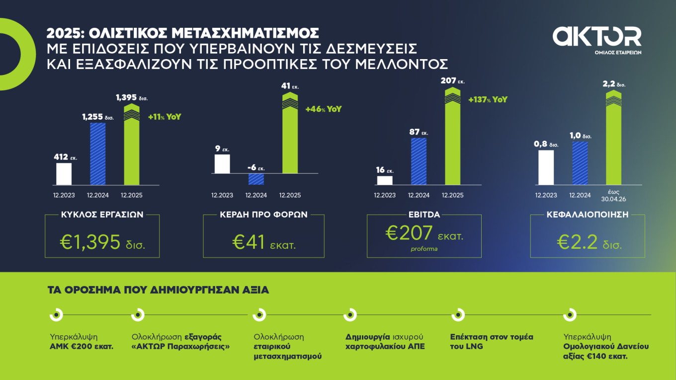 Ισχυρές οικονομικές επιδόσεις κατέγραψε ο Όμιλος AKTOR το 2025, οι οποίες όχι μόνο επιβεβαιώνουν, αλλά και ξεπερνούν τις εκτιμήσεις που είχε παρουσιάσει η Διοίκηση του Ομίλου τον Οκτώβριο του 2024, όπως παρουσιάζεται στις Οικονομικές Καταστάσεις για το 2025 που ανακοινώθηκαν σήμερα στο Χρηματιστήριο Euronext Athens.