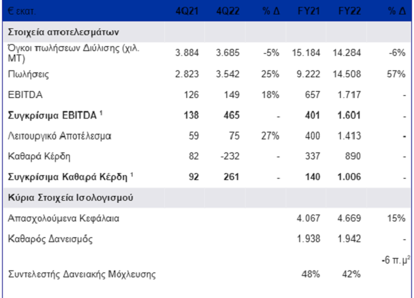 - Ρεκόρ κερδοφορίας, λόγω ευνοϊκού διεθνούς περιβάλλοντος διύλισης και αυξημένης δραστηριότητας στο εξωτερικό. Στα €261 εκατ. τα Συγκρίσιμα Καθαρά Κέρδη Δ’ Τριμήνου 2022, σε €1.006 εκατ. στο σύνολο του έτους. Συνολικό μέρισμα €1,15/μετοχή.