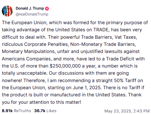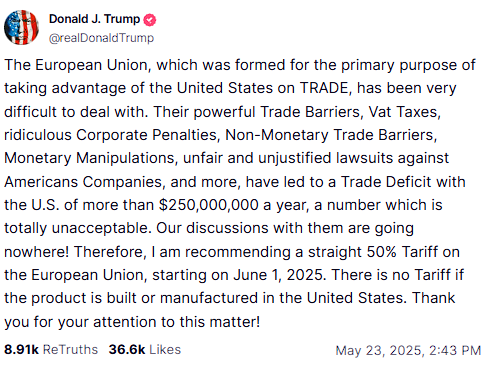 Περίπου 30 λεπτά μετά από αυτήν την ανάρτηση στο Truth Social, ο Τραμπ δήλωσε ότι θα συνιστούσε δασμό 50% στις εισαγωγές ευρωπαϊκών προϊόντων από την 1η Ιουνίου - ένα ποσοστό πολύ υψηλότερο από το ποσοστό 20% της «Ημέρας Απελευθέρωσης» που αργότερα μειώθηκε στο 10%.