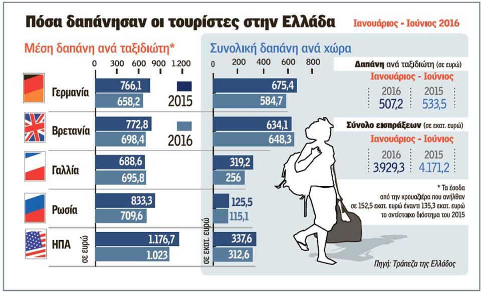 Αναλυτικότερα, την περίοδο Ιανουαρίου-Ιουνίου 2016 οι ταξιδιωτικές εισπράξεις εμφάνισαν μείωση κατά 5,8% σε σύγκριση με την αντίστοιχη περίοδο του 2015 και διαμορφώθηκαν στα 3.929 εκατ. ευρώ. Η εξέλιξη αυτή οφείλεται στη μείωση κατά 4,1% των εισπράξεων από κατοίκους των χωρών της ΕΕ-28, οι οποίες διαμορφώθηκαν στα 2.547 εκατ. ευρώ, και στη μείωση κατά 11,0% των εισπράξεων από κατοίκους των λοιπών χωρών εκτός της ΕΕ-28, οι οποίες διαμορφώθηκαν στα 1.230 εκατ. ευρώ. Ανά χώρα προέλευσης, οι εισπράξεις από τη Γερμανία, -η οποία αποτελεί βασική δεξαμενή τουριστών για την Ελλάδα-, μειώθηκαν κατά 13,4% και διαμορφώθηκαν στα 585 εκατ. ευρώ ενώ οι εισπράξεις από τη Γαλλία υποχώρησαν κατά 19,8% και διαμορφώθηκαν στα 256 εκατ. ευρώ.