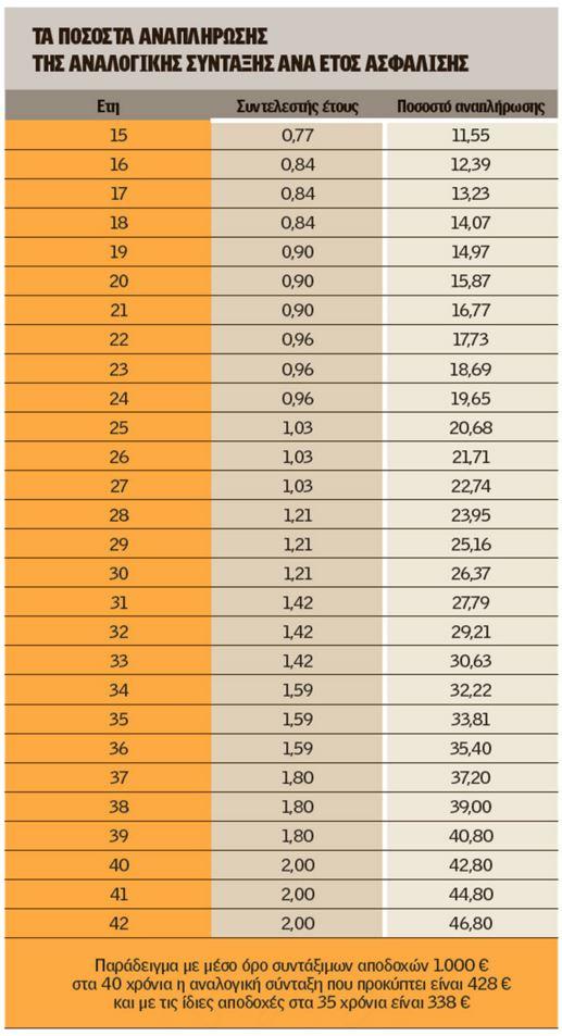 Ο επανυπολογισμός θα γίνει με συντελεστή 0,45% που δίνει ποσοστό αναπλήρωσης 13,5% για 30 έτη, 15,75% για 35 έτη, 18% για 40 έτη και 18,9% για 42 έτη έναντι του 20% 45% που είχαν οι συνταξιούχοι με το προηγούμενο καθεστώς.