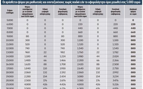 • Μισθωτοί και συνταξιούχοι με ετήσια εισοδήματα πάνω από 12.000 ευρώ και μέχρι 60.000 ευρώ θα δουν τις ετήσιες φορολογικές επιβαρύνσεις τους να αυξάνονται κατά 800 ευρώ. Για παράδειγμα ένας άγαμος μισθωτός με ετήσιο φορολογητέο εισόδημα 20.000 ευρώ σήμερα επιβαρύνεται με φόρο εισοδήματος και ειδική εισφορά αλληλεγγύης συνολικού ύψους 2.676 ευρώ. Αν το αφορολόγητο όριο μειωθεί στις 5.000 ευρώ τότε ο συγκεκριμένος μισθωτός θα δει τη συνολική φορολογική επιβάρυνση του να «φουσκώνει» κατά 800 ευρώ και να διαμορφώνεται στις 3.476 ευρώ